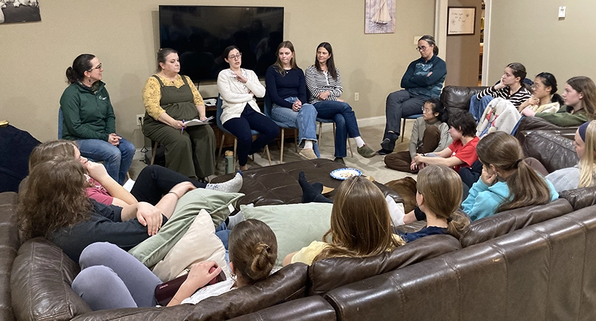 It was a beautiful Friday evening at the Rairdon home as the Dignified Girls Ministry gathered for one of its most memorable nights yet. Dignified meets two to three times each semester, usually on a Friday evening, and is a time of fellowship over food and fun and also learning how to apply God’s Word to our lives. Each month has a different theme. In the fall, Miss Ellie and Mrs. Piper Loveless led a discussion on anxiety and how to have practical techniques for this bodily experience. Then in December, there was a special Christmas swap and conversation about celebrating the little blessings of life! This particular gathering in March featured a panel of moms, along with alumna Annie Rairdon, who shared thoughtful wisdom, encouragement, and insight with our high school girls as they explored questions about godly relationships, dating, marriage, and friendship.